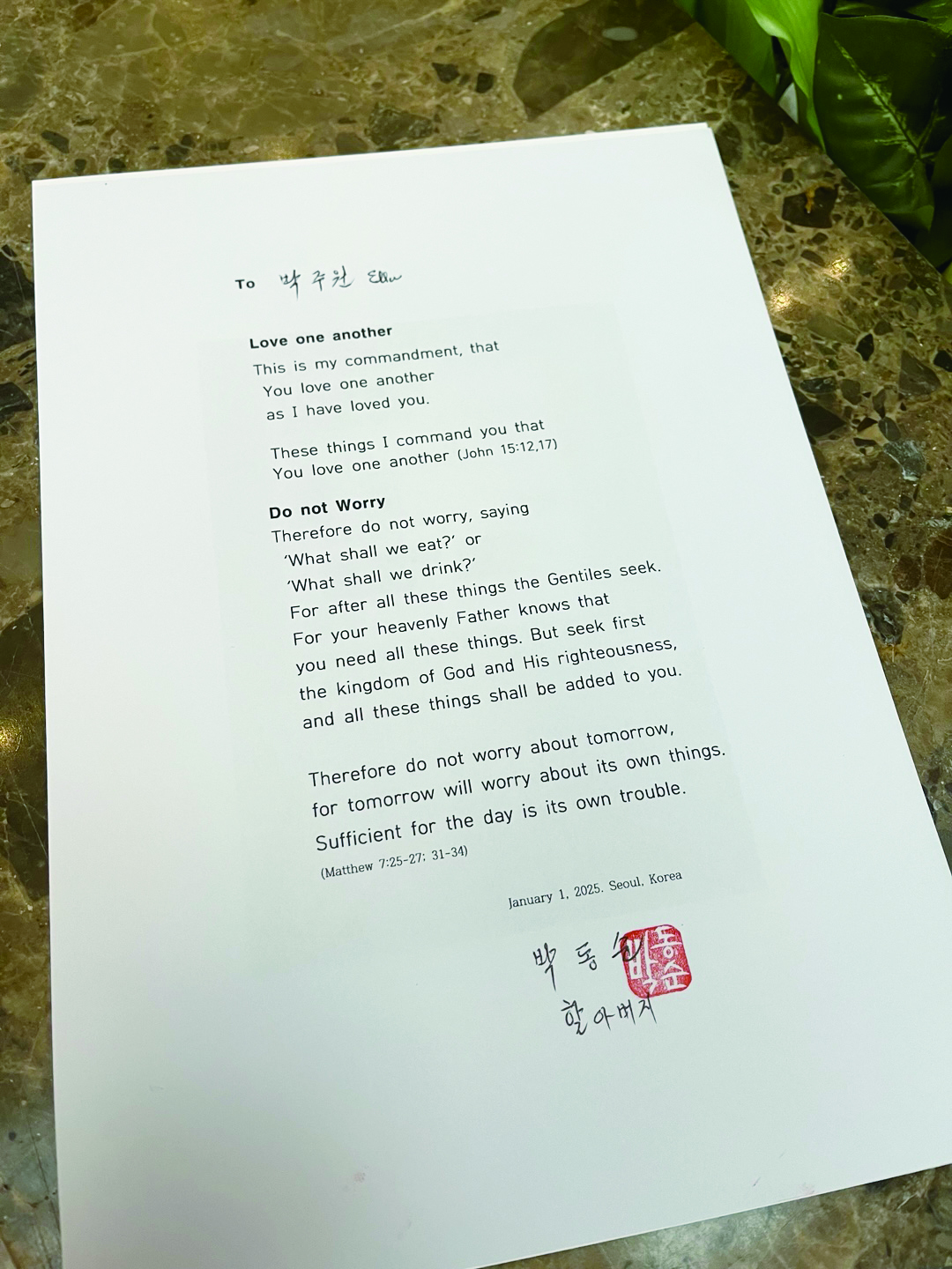내가 올해 90세를 맞아 미국에 있는 두 아들 가족과 친척들이 모두 모여 축하를 했어요. 이날 다섯 손주에게 해 주고 싶은 말을 성경에서 뽑아서 주었어요. “Love one another”(요한복음 15:12, 17), “Do not Worry”(마태복음 6:25-27, 31-34). 2025년 1월 1일, 이 두 말씀을 프린트하여 할아버지 이름을 쓰고 도장을 찍어 예쁜 액자에 넣은 뒤 손자, 손녀 들에게 각각 하나씩 주었습니다. 두고두고 그들의 삶에 교훈이 되기를 바라면서….
