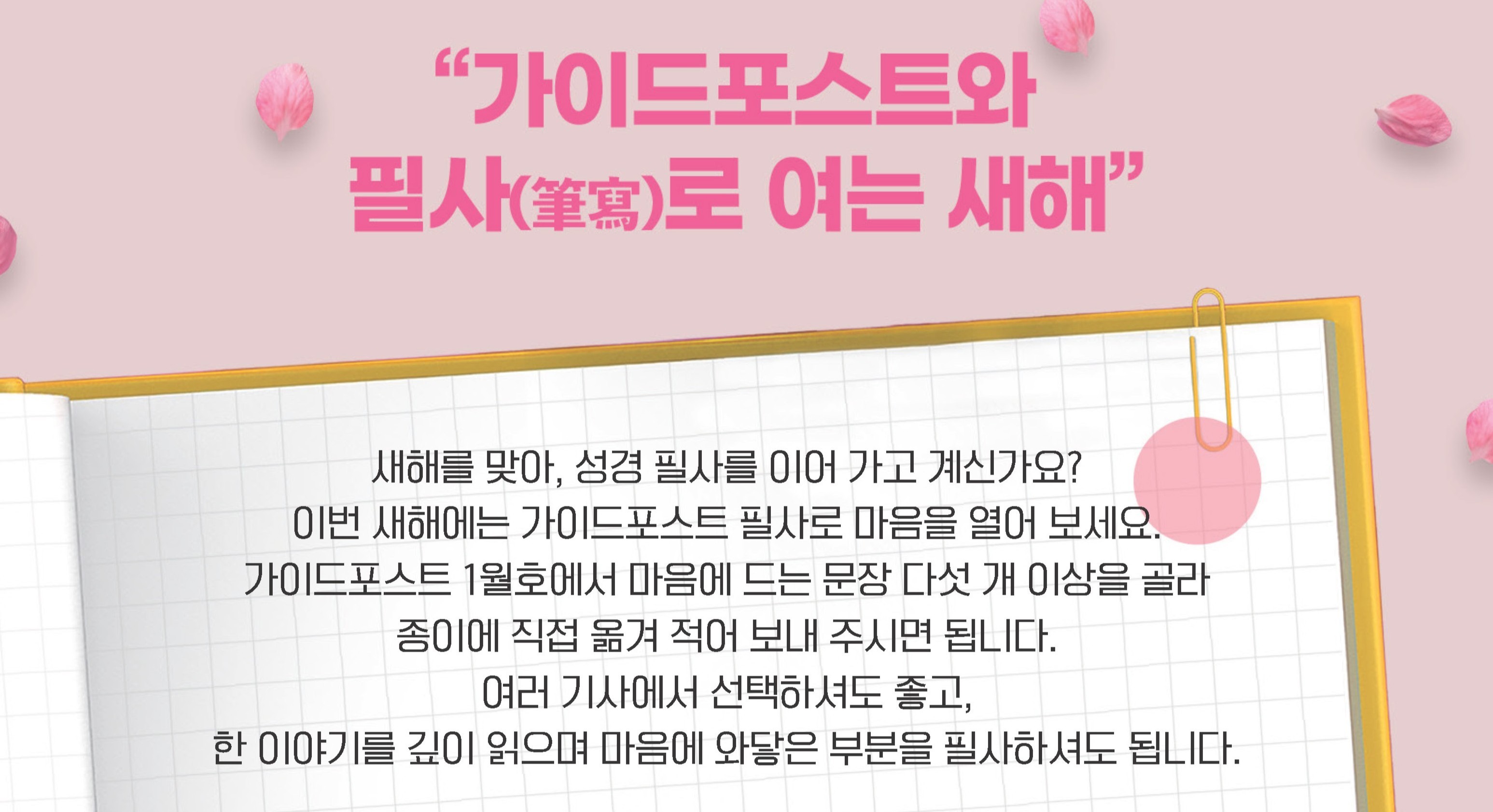 독자들은 정통 영한 대역 잡지인 가이드포스트를 통하여 현장감 있는 영어를 공부할 수 있습니 다. 더불어 다른 사람들의 삶에 대해 앎으로써 내 삶에 필요한 용기와 도전을 얻고, 영적인 성장에도 도움을 얻을 수 있습니다.